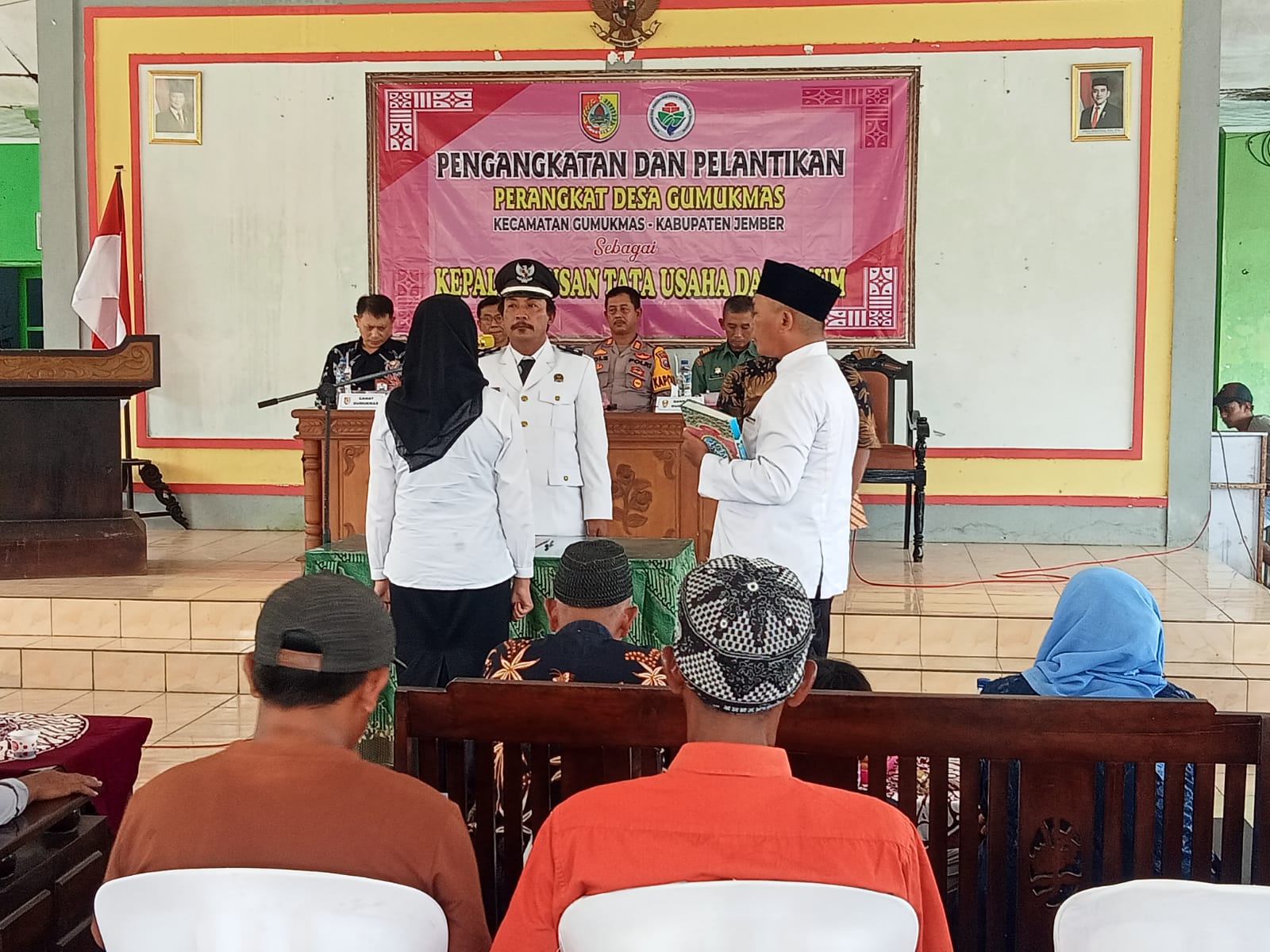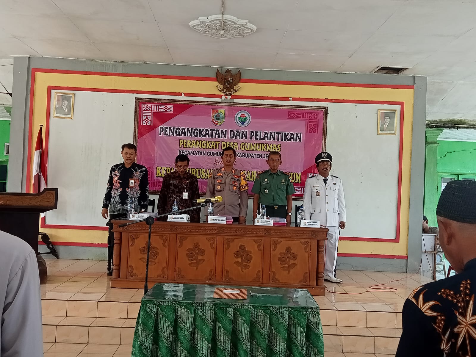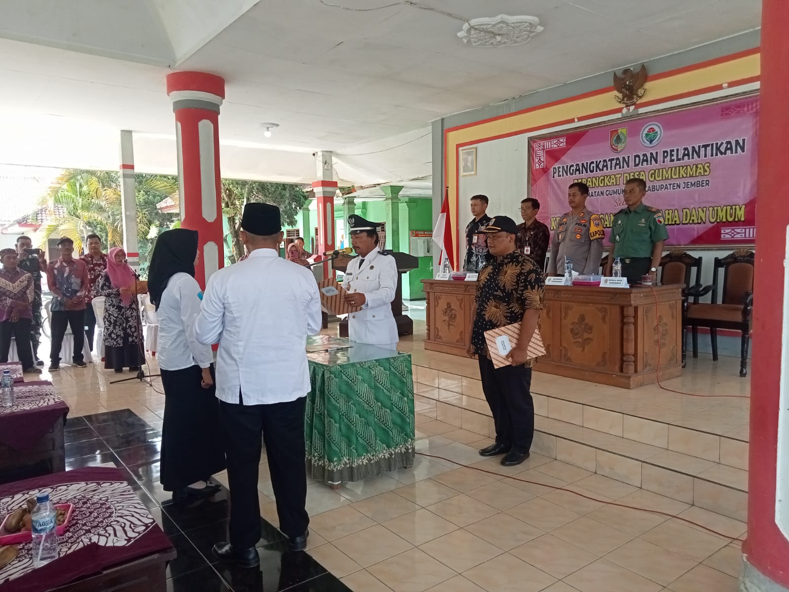 Dalam sambutannya kepala desa Gumukmas Rudianto menyampaikan pesan harapan agar bisa bekerja dengan baik dan punya jiwa sosial yang tinggi sehingga dapat melayani warganya di wilayahnya sebagai perangkat yang bisa membangun desa diwilayahnya dapat menjalankan amanah dengan penuh tanggung jawab serta peran aktif dalam mendukung program-program pembangunan desa.