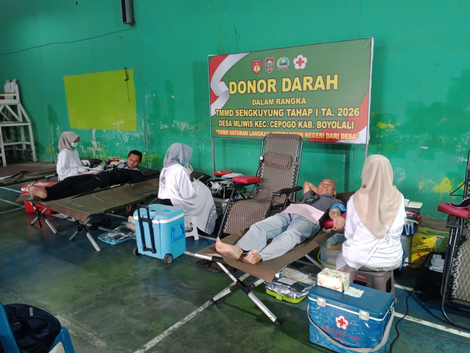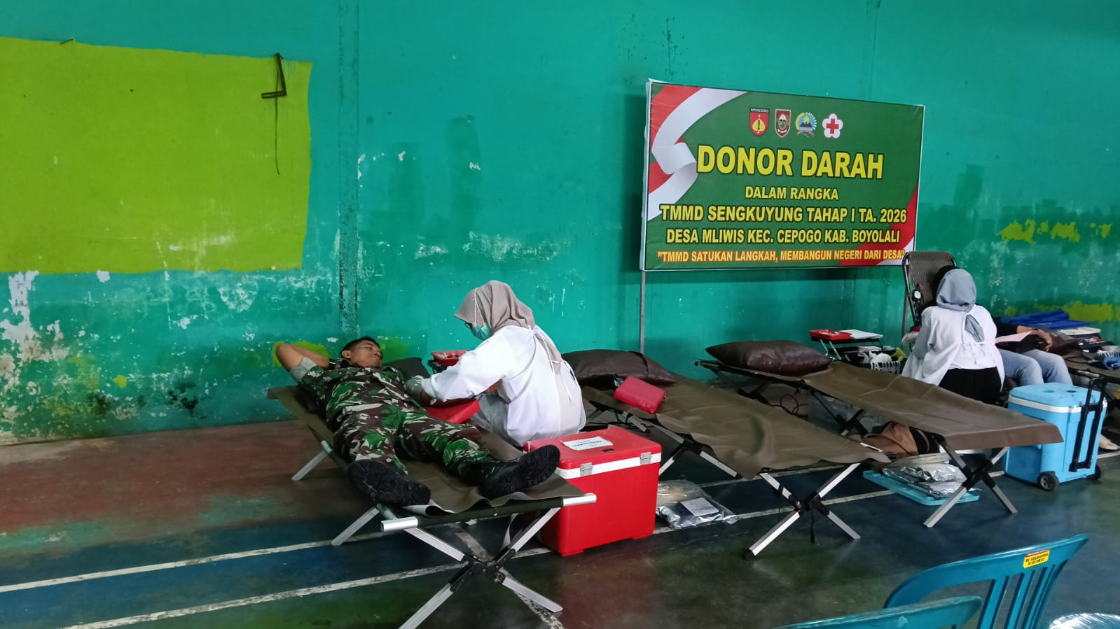 Boyolali — Sakti.i.news.site.Program TNI Manunggal Membangun Desa (TMMD) Sengkuyung Tahap I Kodim 0724/Boyolali tak hanya fokus pada pembangunan infrastruktur. Di Desa Mliwis, Kecamatan Cepogo, Satgas TMMD menggelar kegiatan donor darah di Balai Desa Mliwis, Senin (16/02/26), sebagai bagian sasaran non-fisik untuk meningkatkan kesehatan masyarakat.