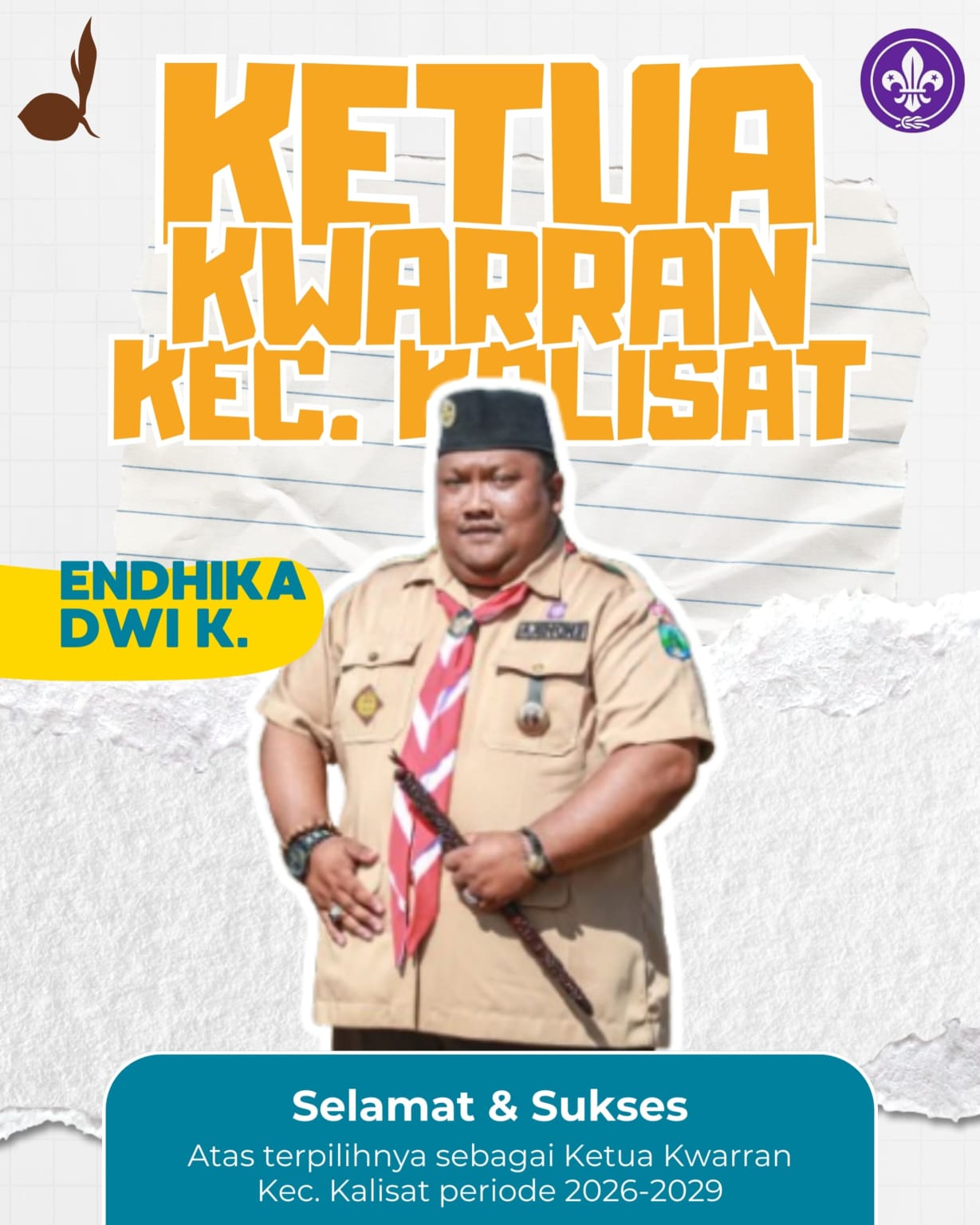 Dalam forum tertinggi tingkat ranting tersebut, Kak Endhika Dwi Kadariyanto,S.Pd secara resmi terpilih oleh 72 orang peserta sebagai Ketua Kwartir Ranting (Kwarran) Kalisat masa bakti 2026-2029 melalui proses aklamasi. Terpilihnya Kak Endhika secara aklamasi mencerminkan tingginya rasa kekeluargaan dan kepercayaan dari seluruh gugus depan di wilayah Kalisat. Tanpa adanya gejolak, seluruh peserta Musran sepakat satu suara memberikan kepercayaan tongkat estafet kepemimpinan kepada beliau.