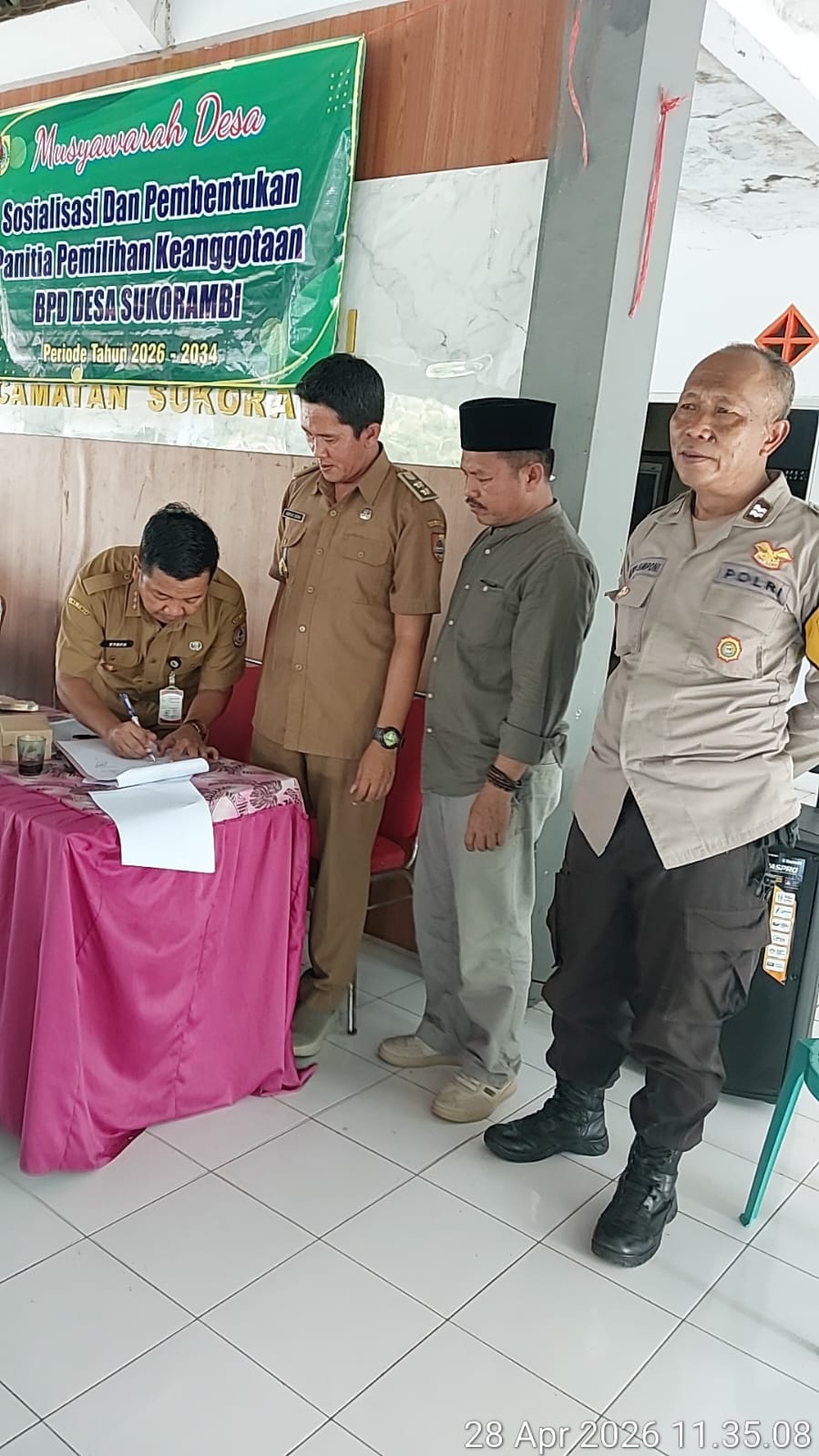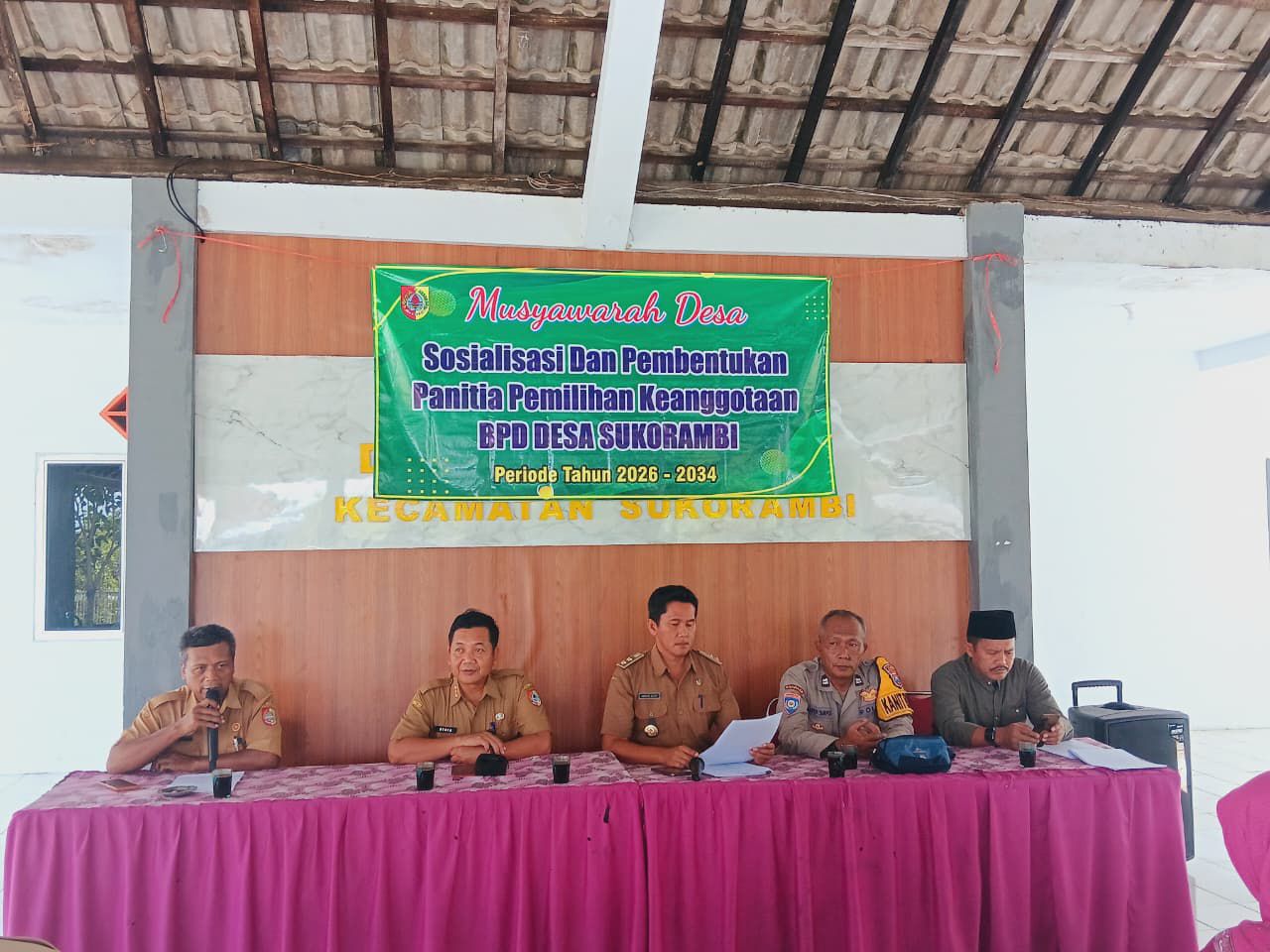JEMBER – 29 April 2026. Pemerintah Desa Sukorambi menggelar kegiatan Musdes Sosialisasi dan Pembentukan panitia pengisian anggota Badan Permusyawaratan Desa (BPD) untuk masa jabatan 2026-2034. Acara yang berlangsung di pendopo balai Desa Sukorambi pada Selasa 28/04/2026 dihadiri Camat dan Sekcam Sukorambi,Polsek Sukorambi, perangkat desa, ketua dan anggota BPD, tokoh masyarakat, tokoh agama, serta perwakilan unsur perempuan.